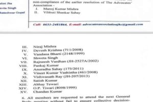 हाईकोर्ट की कोलेजियम से झारखंड हाईकोर्ट के वकीलों के नाम जजों के लिए नहीं भेजने के निर्णय का विरोध एक बार फिर किया गया। इसके साथ ही एसोसिएशन से निर्णय लिया कि उक्त न्यायालयों की कार्यवाही में शामिल होने वाले 15 अधिवक्ताओं के विरुद्ध कार्रवाई की जाएगी।