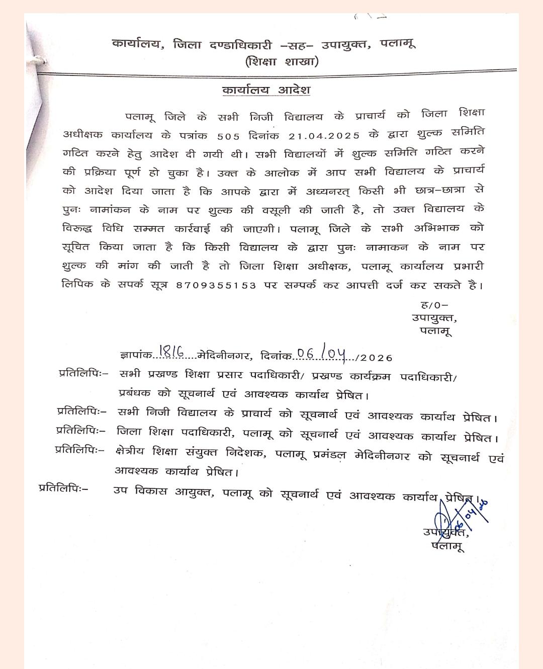 मेदिनीनगर : जिले में विद्यालयों द्वारा री-एडमिशन के नाम पर अभिभावकों से अवैध शुल्क वसूली की शिकायतों को गंभीरता से लेते हुए उपायुक्त ने कड़ा रुख अपनाते हुए स्पष्ट निर्देश जारी किया है कि किसी भी विद्यालय में इस नाम पर किसी प्रकार का शुल्क लिया गया तो संबंधित संस्थान पर सख्त कार्रवाई की जाएगी।