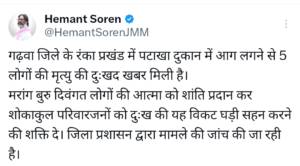 घटना पर मुख्यमंत्री हेमंत सोरेन ने शोक जताते हुए सोशल मीडिया साइट एक्स पर पोस्ट किया। उन्होंने दिवंगत लोगों की आत्मा को शांति प्रदान कर शोकाकुल परिजनों को दुख की घड़ी को सहन करने की शक्ति देने की प्रार्थना की।