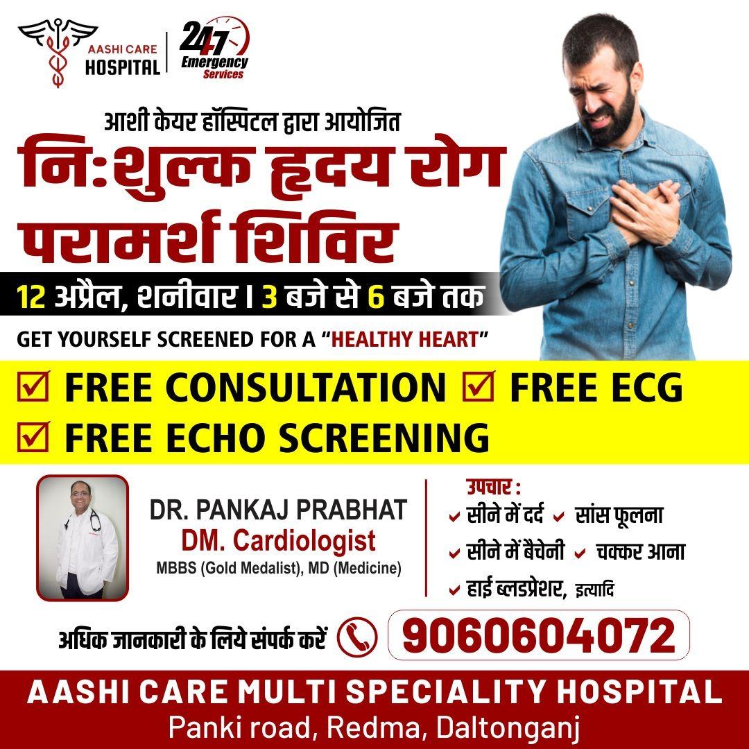 Free heart disease consultation and checkup camp : पांकी रोड़ स्थित आशी केयर अस्पताल में 12 अप्रैल, शनिवार को नि:शुल्क हृदय रोग परामर्श व जांच शिविर का आयोजन किया जाएगा। शिविर में वरिष्ठ हृदय रोग विशेषज्ञ डीएम कार्डियो डॉ पंकज प्रभात दोपहर 3.30 बजे से संध्या 7 बजे तक जरूरतमंद रोगियों की जांच करेंगे। पलामू प्रमंडल सहित अन्य जगहों के भी रोगी नि:शुल्क जांच करा सकेंगे।