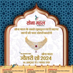 लाइव पलामू न्यूज/मेदिनीनगर: पलामू प्रमंडल के चर्चित ज्वेलरी शोरूम सोना महल में इन दिनों धनतेरस एवं दिवाली के उपलक्ष्य में भव्य ज्वेलरी प्रदर्शनी लगाई गई है। जो कि 15 अक्टूबर यानी मंगलवार से 1 नवंबर तक चलेगी। जिसमें ग्राहकों को दिल्ली, मुंबई राजकोट, मेरठ एवं दुबई तक की ज्वेलरी खरीदने का मौका मिल सकता है। इस संबंध में सोना महल के संचालक संतोष कुमार सोनी एवं धनंजय कुमार सोनी ने बताया कि धनतेरस के शुभ अवसर पर ग्राहकों के लिए विशेष छूट के रूप में ₹50,000 के डायमंड ज्वेलरी की खरीदारी पर 10 ग्राम चांदी का सिक्का बिल्कुल मुफ्त एवं 10 ग्राम सोने की ज्वेलरी की खरीदारी पर 2250 रुपए की भारी छूट दी जा रही है।
