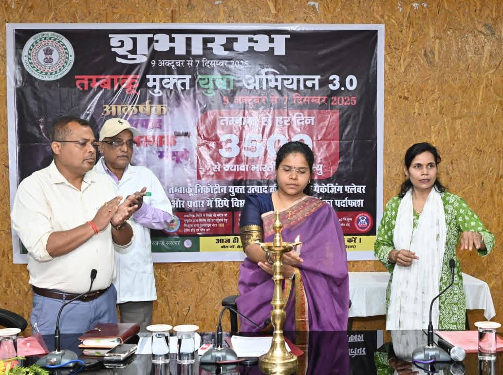 चतरा : राष्ट्रीय तंबाकू नियंत्रण कार्यक्रम के तहत 60 दिवसीय “टोबैको फ्री यूथ कैंपेनिंग 3.0” का शुभारंभ उपायुक्त कीर्तिश्री द्वारा समाहरणालय सभा कक्ष में दीप प्रज्वलित कर किया गया। इस अवसर पर समाहरणालय परिसर में हस्ताक्षर अभियान प्रचार वाहन को हरी झंडी दिखाकर जागरूकता कार्यक्रम की औपचारिक शुरुआत की गई।