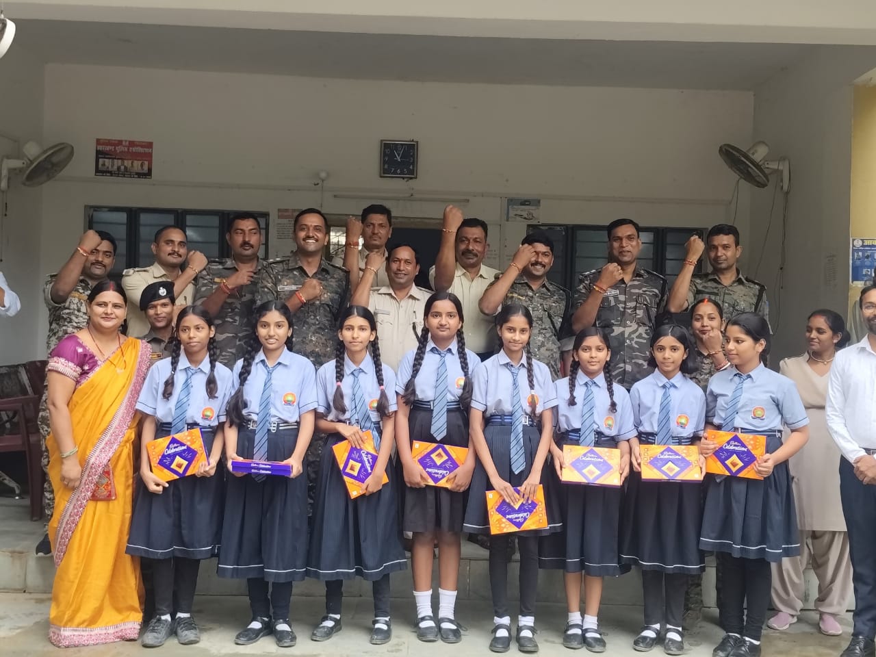मेदिनीनगर : हुसैनाबाद थाना परिसर में रक्षाबंधन का पावन त्यौहार हर्षोल्लास के साथ मनाया गया। क्षेत्र के विभिन्न स्कूलों से आए नन्हें-मुन्ने बच्चों ने थाना प्रभारी एवं पुलिस पदाधिकारियों को राखी बांधकर भाई-बहन के अटूट संबंध का प्रतीक प्रस्तुत किया।
