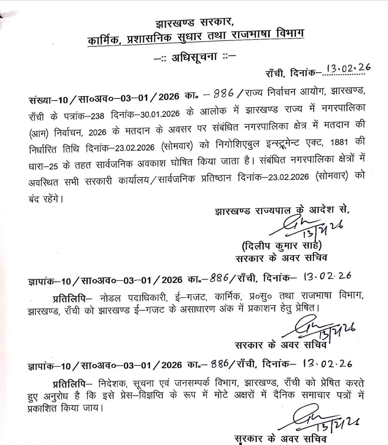 अधिसूचना के अनुसार निगोशिएबल इंस्ट्रूमेंट्स एक्ट, 1881 की धारा-25 के तहत मतदान के दिन सार्वजनिक अवकाश रहेगा। 23 फरवरी को झारखंड नगर निकाय चुनाव के तहत मतदान होना है। इस अवसर पर संबंधित नगरपालिका क्षेत्रों में स्थित सभी सरकारी कार्यालय और सार्वजनिक प्रतिष्ठान बंद रहेंगे।