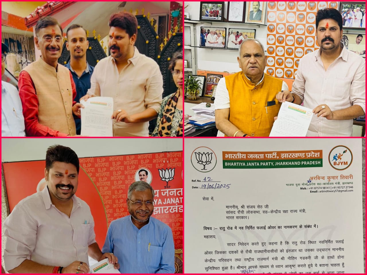 उन्होंने बताया कि मुख्यमंत्री हेमंत सोरेन को पत्राचार के माध्यम से भारतीय जनता पार्टी के प्रदेश अध्यक्ष सह पूर्व मुख्यमंत्री बाबुलाल मरांडी, केन्द्रीय रक्षा राज्यमंत्री सह सांसद राँची लोकसभा संजय सेठ और पूर्व विधानसभा अध्यक्ष सह राँची विधानसभा के लोकप्रिय विधायक सीपी सिंह इत्यादि से शिष्टाचार मुलाक़ात कर भारतीय स्वतंत्रता संग्राम के महान आदिवासी स्वतंत्रता सेनानी नीलांबर और पीतांबर के नाम पर नवनिर्मित रातू रोड फ्लाई ओवर का नामकरण हेतु ज्ञापन सौंपा है।