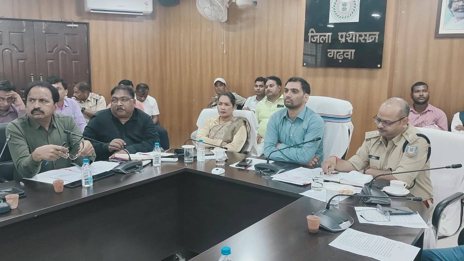 गढ़वा: मंगलवार को जिले के समाहरणालय स्थित सभागार कक्ष में आगामी दुर्गा पूजा को शांत एवं सौहार्दपूर्ण वातावरण में संपन्न कराने को लेकर एसपी एवं उपायुक्त के संयुक्त अध्यक्षता में जिला स्तरीय शांति समिति का बैठक आयोजित किया गया। इस बैठक में जिले के सभी प्रशासनिक एवं पुलिस पदाधिकारी मौजूद रहे। इसके साथ ही जिले के सभी प्रखंडों से आमंत्रित लगभग 150 अलग-अलग धर्म के विशिष्ट लोग भी उपस्थित रहे।